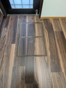 因みに、床は元キッチンのため、穴もあいており、やり替えました。今回は、厚さ1.5㎜の「ウスイータ」を使い、床下点検口の枠周りなどの段差も気にならない仕上がりになっています。