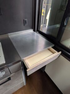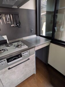 キッチンはクリナップのシステムキッチンでコンパクトにまとめましたが、造作の作業台や収納棚で収納力をカバーしています。