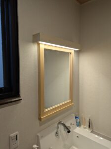 洗面はW1200のカウンタータイプでゆったりした空間になりました。鏡は木で囲い照明を仕込んで、やらわかい感じになりました。